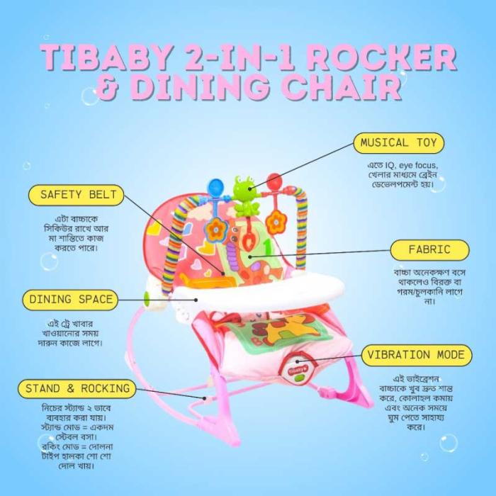 টি বেবি টডলার রকার ডাইনিং চেয়ার একটি বিশেষভাবে ডিজাইন করা চেয়ার যা শিশুদের জন্য সুরক্ষা এবং আরাম প্রদান করে। এটি একটি রকার চেয়ার হিসেবে ব্যবহৃত হয়, যার ফলে ছোট শিশুদের জন্য শোয়ার সময় বা খাবার খাওয়ার সময় আরামদায়ক অভিজ্ঞতা তৈরি হয়।